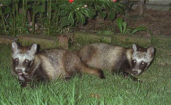 The Tanuki or Japanese raccoon faced dog is a real creature living in the region of Japan around the Amur river. It is Canis viverriuns, nyctereutes or procionides, that belongs to the dog family.
